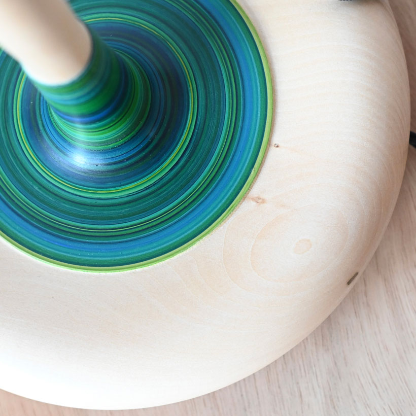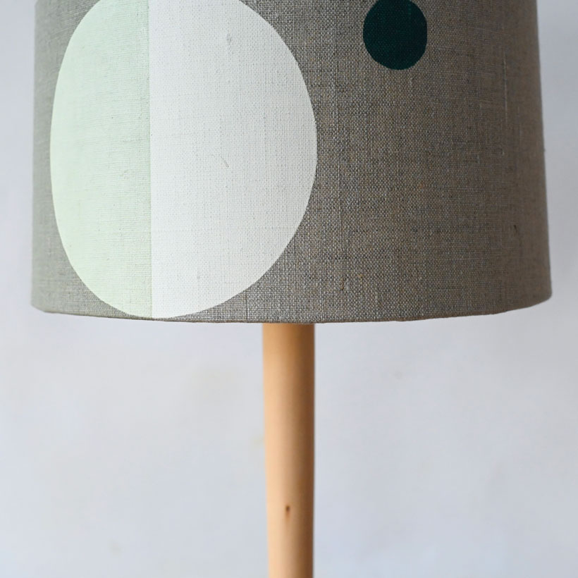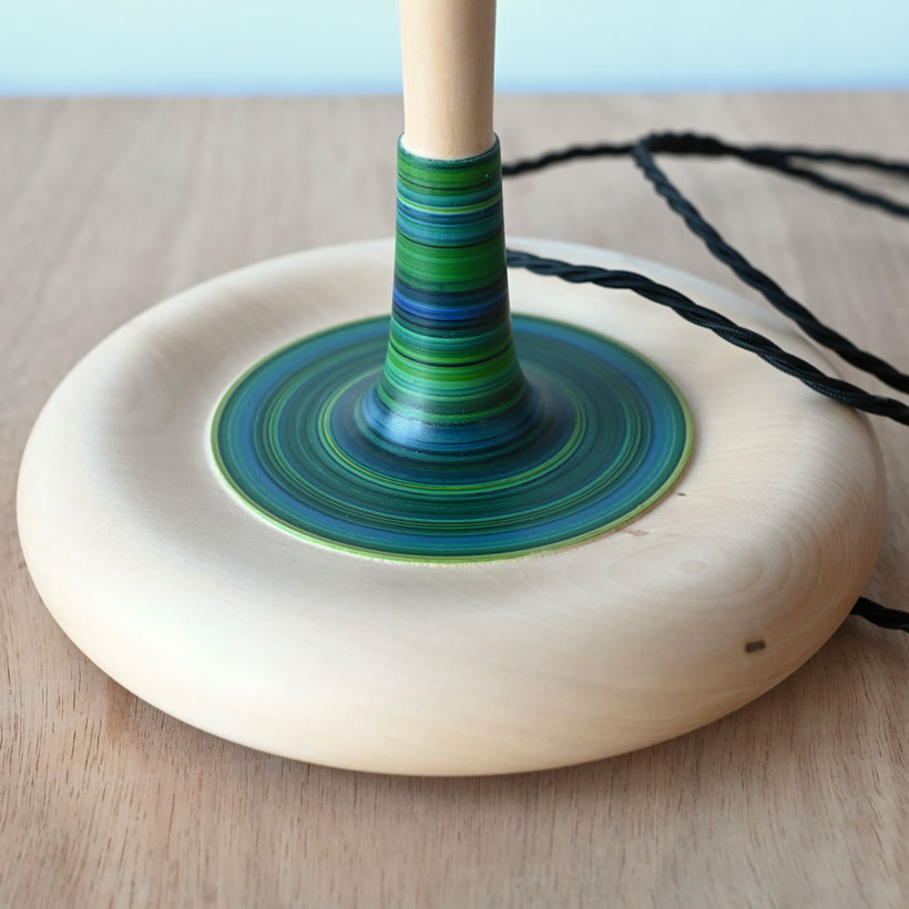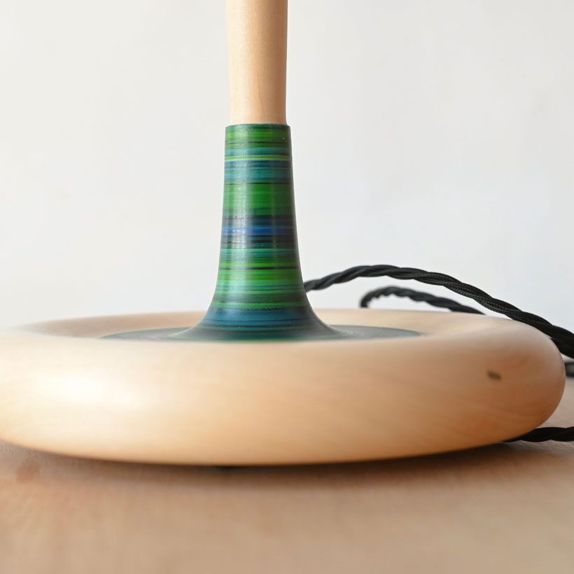 A simple and elegant lamp made from lime into a new form with a new curvaceous and much heavier base and a simple elegant upright, I have defined and isolated an area for the stripes  which to my mind reminds me of a stripy sock on a leg.  The stripy section is all the more attractive and captivating for it being isolated. This lamp was painted in December and I think was inspired by the mid winter season, stained glass windows and wintery colours, in my product photos I have paired it with a printed shade made at the same time, and having a similar vibe. The height and new form this lamp takes suits it to a larger shade and it is photographed with  25CM shade and could take larger for instance 28cm. I’ve wired it with a navy twisted cable.
