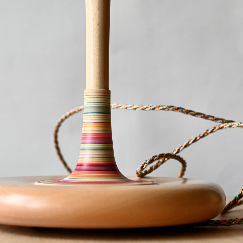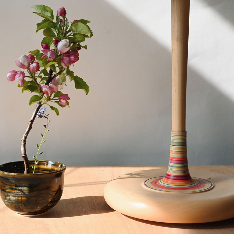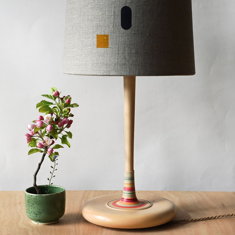 A simple and elegant lamp made from lime into a new form with a new curvaceous and much heavier base and a simple elegant upright, I have defined and isolated an area for the stripes  which in my mind reminds me of a stripy sock on a leg.  The stripy section is all the more attractive and captivating for it being isolated. The height and new form this lamp takes suits it to a larger shade and it is photographed with  25CM shade and could take larger for instance 28cm. I’ve wired it with a multicoloured twisted cable which works well with the overall design.