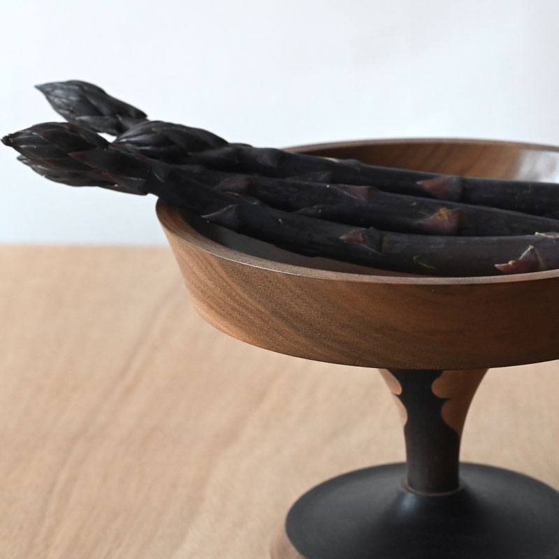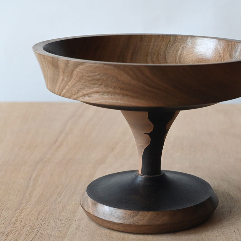 A lovely raised walnut plate with curved sides and an ebonised underside and base, there is painted detail on the stem of dusky pink profiles on a dark walnut stem ( the process of ebonising timber is to expose it to liquid iron oxide and this causes the wood to darken naturally) These bowls utilise small and odd pieces of timber and offer chances to elevate food items and echo the sensual delights of food with the two particularly charming facial profiles of noses and lips, are they eating or kissing?  The plate or shallow bowl is made from a beautiful and dark piece of walnut , utilising small off-cuts for the base and pedestal it is adding value to near worthless pieces of timber. The plate is finished in a food safe oil and is washable, and the base is polished and is washable only with a damp cloth.