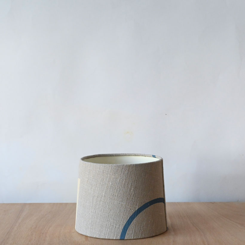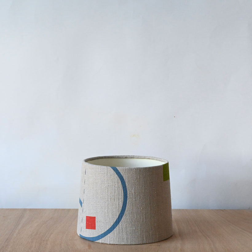 This single shades is made up from a length of hand printed linen on which I silk screened an abstract composition which was intended to be cut up and to give up random compositions, the components on this edition are a creamy off white, spring green, blue and pink. they suit the bare timber lamps beautifully. the lampshade is backed with cream card and has a stitched seam. Views from all angles are in the gallery.