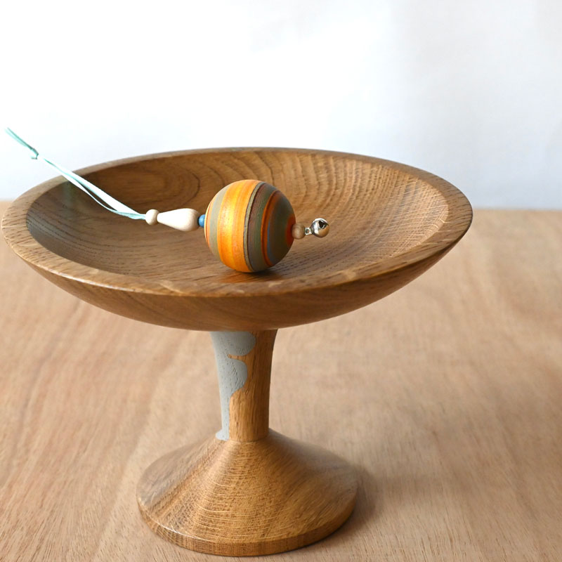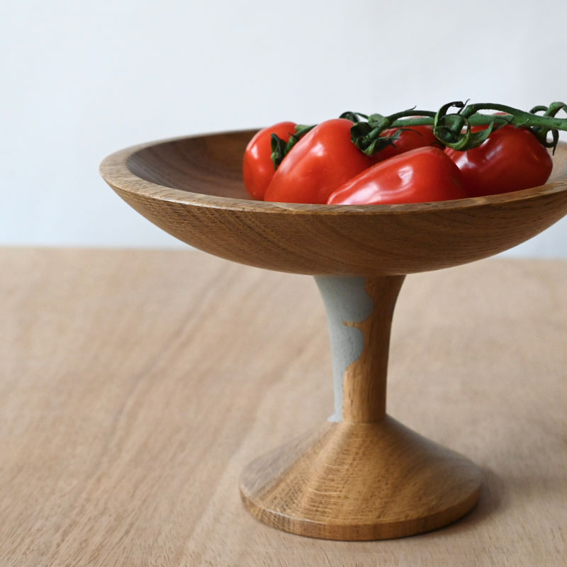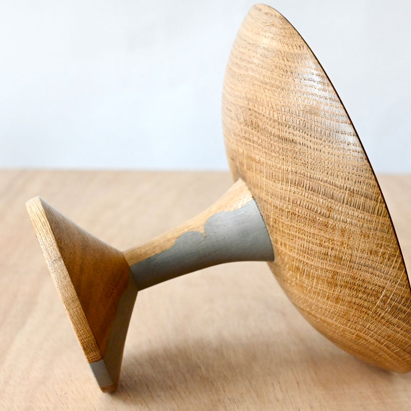 A raised oak shallow bowl with painted detail on the stem and base.  Made from oak with an elegant grain it is decorated on the stem and goes onto the base , in this case in a soft grey colour. Elevating food items and echoing the sensual delights of food with the two facial profiles of noses and lips, are they eating or kissing? The bowl has a gentle curve, please find the dimensions below. The bowl is finished in a food safe oil and is washable, and the base is polished and is washable only with a damp cloth.