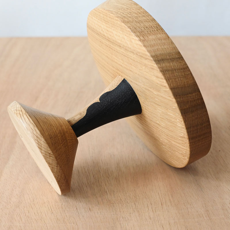 A raised oak plate with painted detail on the stem and base.  Made from oak with an elegant grain it is decorated on the stem, in this case in black.These raised dishes which utilise small and odd pieces of timber which might be heading for the woodpile elevate food items and echo the sensual delights of food with the two facial profiles of noses and lips, are they eating or kissing? The plate is quite shallow, please find the dimensions below. The plate is finished in a food safe oil and is washable, and the base is polished and is washable only with a damp cloth.