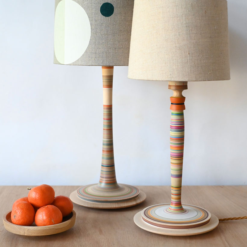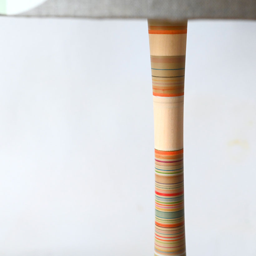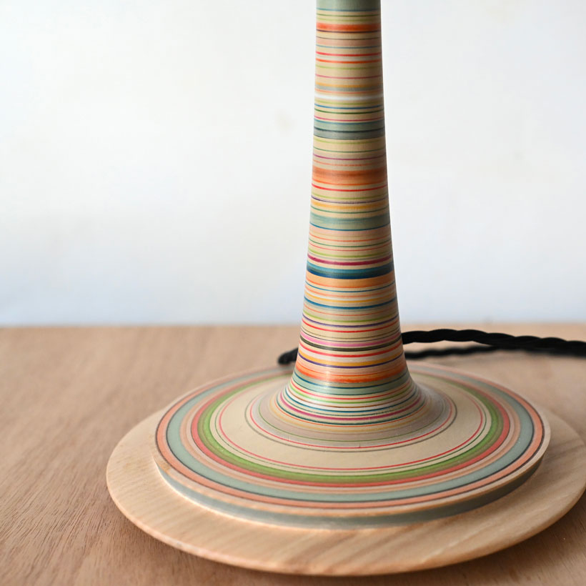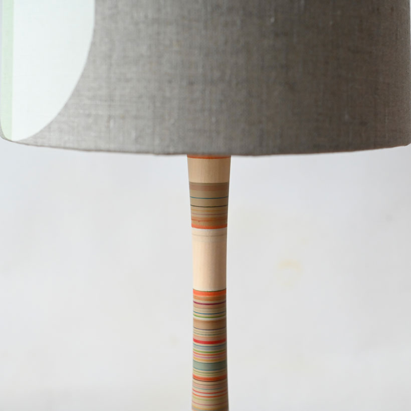 An elegant and  colourful lamp made from lime in a new shape, slightly taller than my usual stripy lamp, the lamp is painted with bright and  fine multi-coloured stripes with areas of minimal decoration breaking up the overall composition .   This lamp will always hold interest as there are so many interesting juxtapositions of colours within it, great for contemplation on a bedside table! There is a lovely warmth to the colours in this lamp. This lamp is photographed with a 25cm printed linen shade, it would be worth considering one of my plain linen shades as well. A 25cm or 28cm shade would also be appropriate.