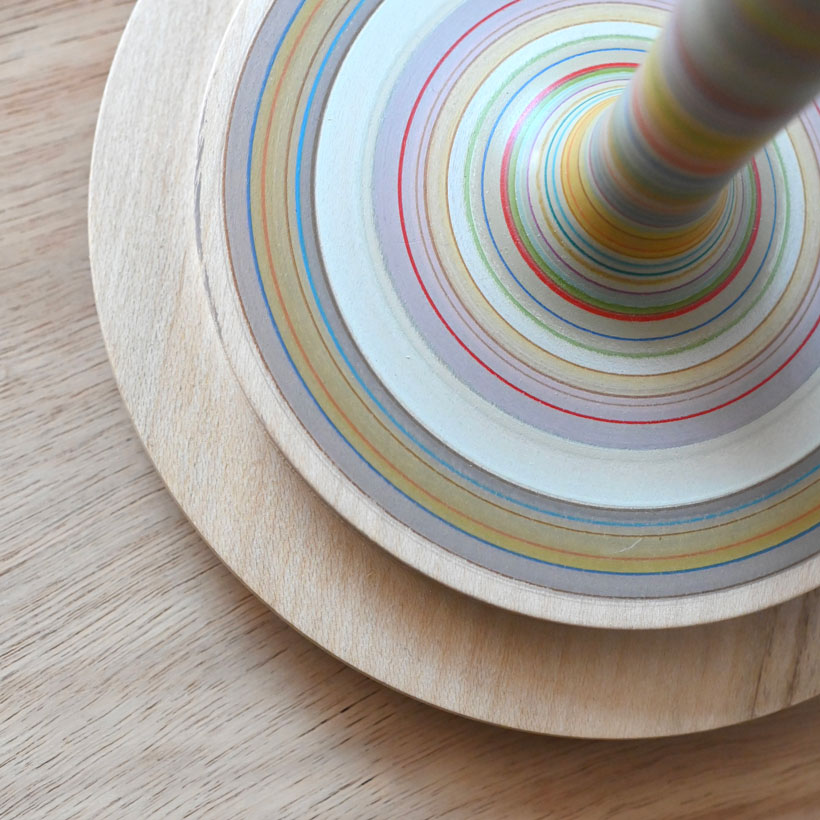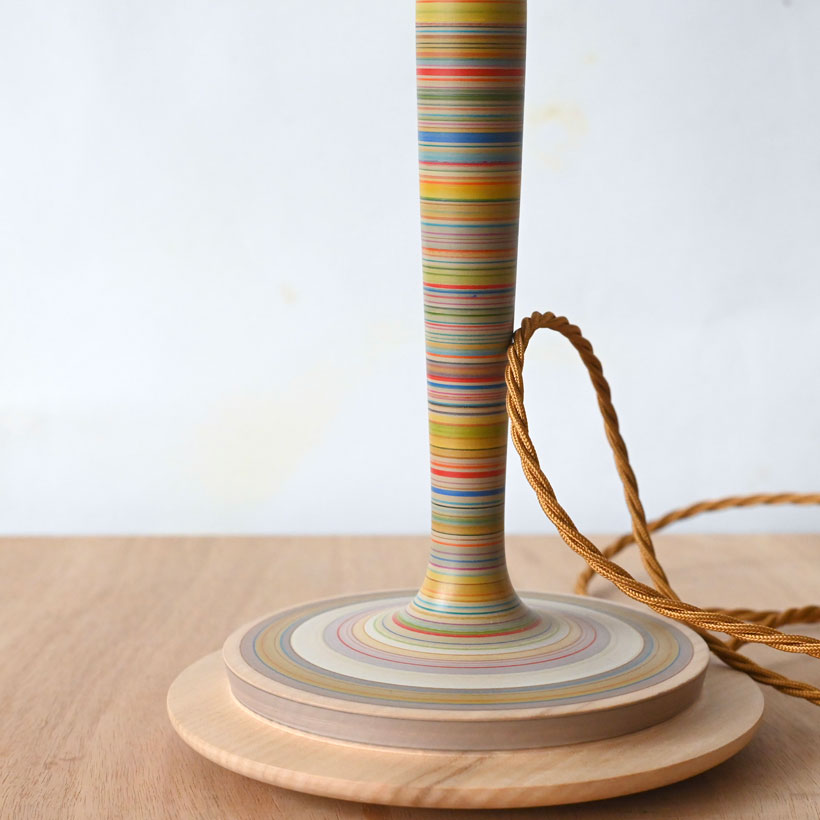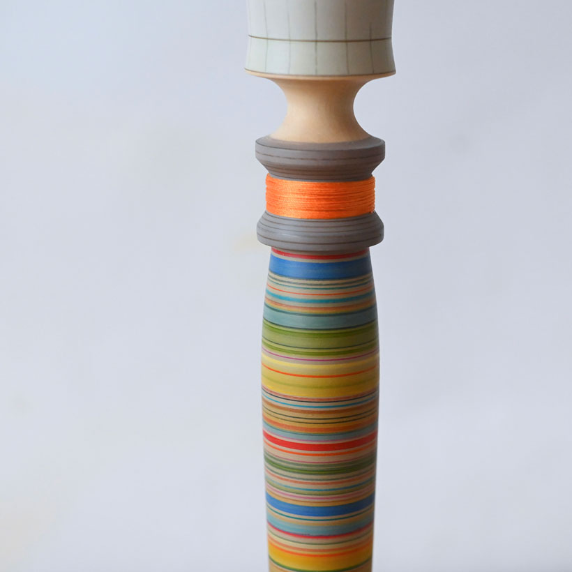 An elegant and  colourful lamp made from lime with a cotton reel motif, the lamp is painted with bright and  fine multi-coloured stripes, there is a warm undertone of golden yellows, greens and violet, there is a grey reel wound with orange  thread. The base has broader and simpler bands of greys with yellow and red accents.  There is a section of natural wood above the reel and then a section at the very top painted in a warm cream with fine lines, really lovely. This lamp will always hold interest as there are so many interesting juxtapositions of colours within it, great on a bedside table! This lamp is photographed with a 20cm plain linen shade, it would be worth considering one of my unique silk screen printed shades as well. A 23cm or 25cm shade would also be appropriate.