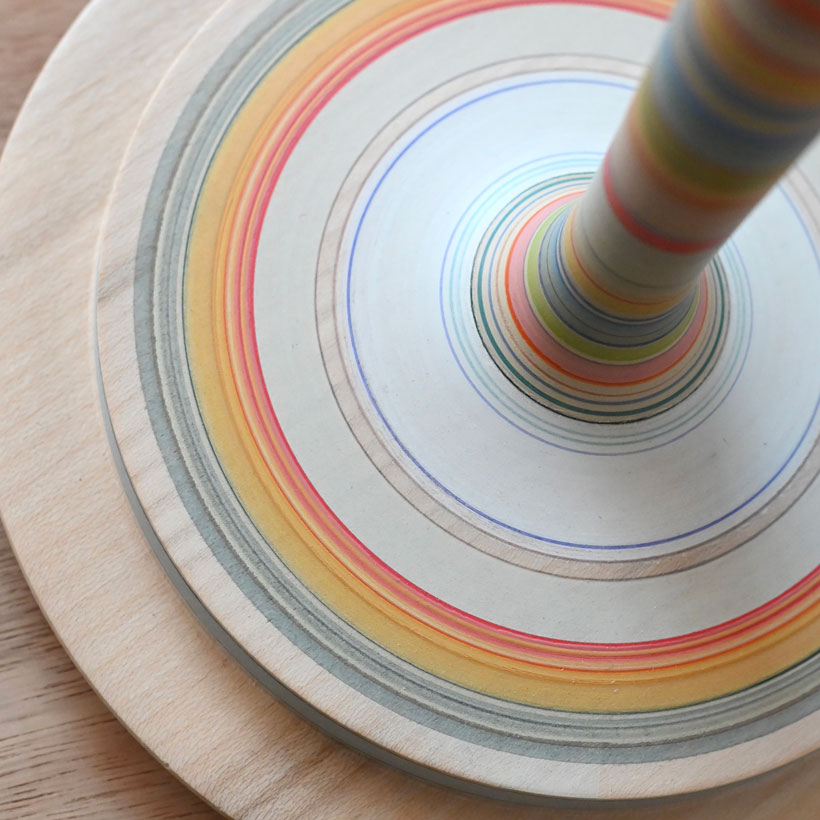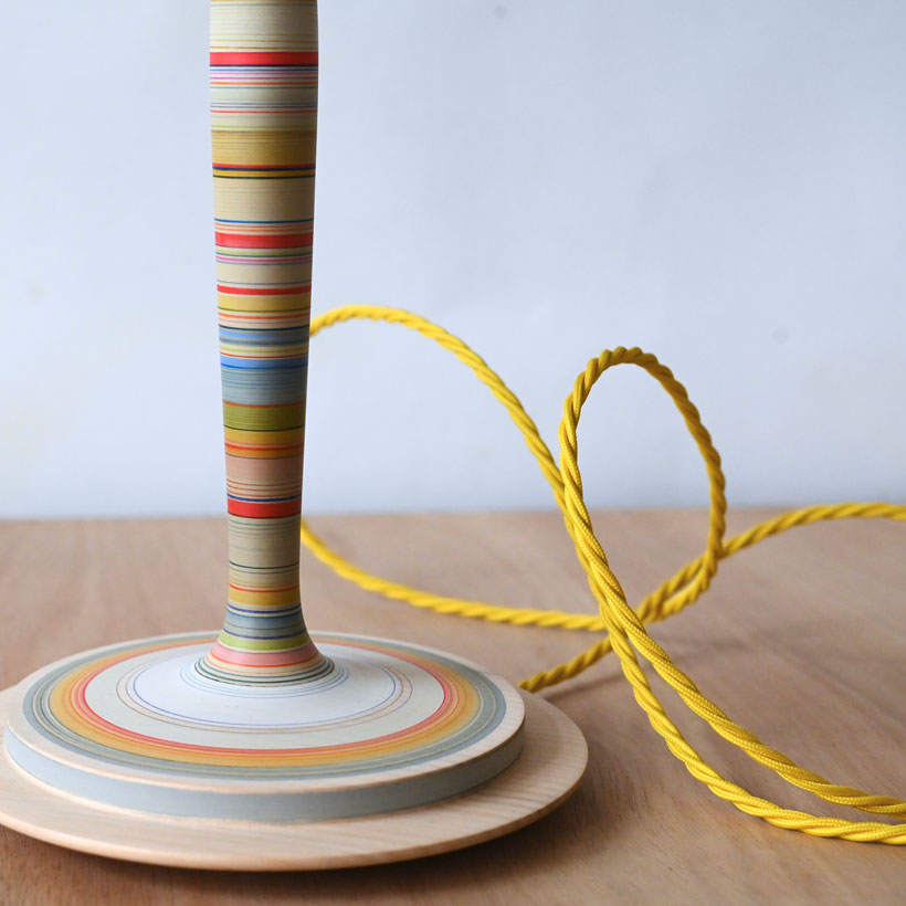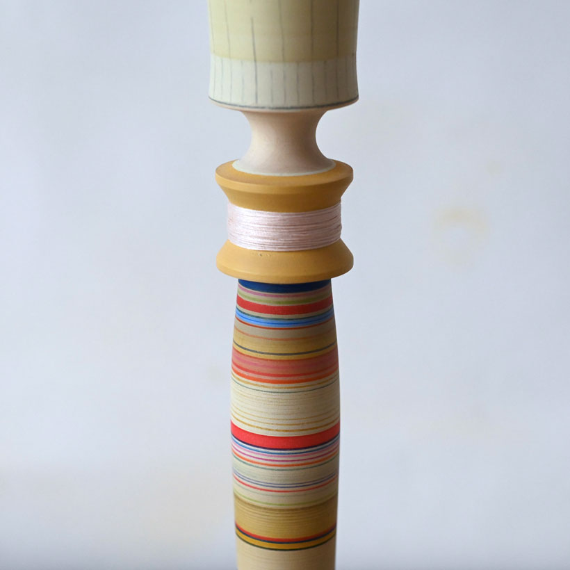 An elegant and  colourful lamp made from lime with a cotton reel motif, the lamp is painted with bright and also fine multi-coloured stripes, with areas of minimal fine spiralling lines breaking up other colourful areas, a bit like a rhythmical  pattern descending the shaft of the lamp.  There is a sandy yellow reel wound with pale ballet pink thread. The base has broader and simpler bands of greys with yellow and red accents.  There is a section of natural wood above the reel and then a section at the very top painted in a pale cream with fine lines, quite lovely. This lamp will always hold interest as there are so many interesting juxtapositions of colours within it, great for contemplation on a bedside table! This lamp is photographed with a 20cm plain linen shade, it would be worth considering one of my unique silk screen printed shades as well. A 23cm or 25cm shade would also be appropriate.
