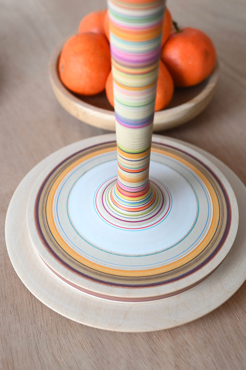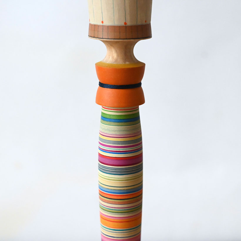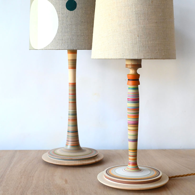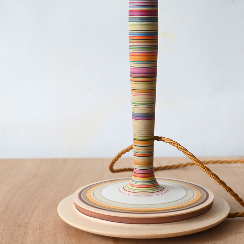 An elegant and  colourful lamp made from lime with a cotton reel motif, the lamp is painted with bright and also fine multi-coloured stripes, with areas of minimal fine lines breaking up other colourful areas, a bit like a repeat pattern, there are bold violets, yellows and oranges on this lamp.  There is a small orange bobbin wound with a thin line of navy thread. The base has broader and simpler bands of browns with yellow and red accents.  There is a section of natural wood above the reel and then a section at the very top painted in two neutral tones with fine blue lines and little dots, really lovely. This lamp will always hold interest as there are so many interesting juxtapositions of colours within it, great on a bedside table! This lamp is photographed with a 20cm plain linen shade, it would be worth considering one of my unique silk screen printed shades as well. A 23cm or 25cm shade would also be appropriate.