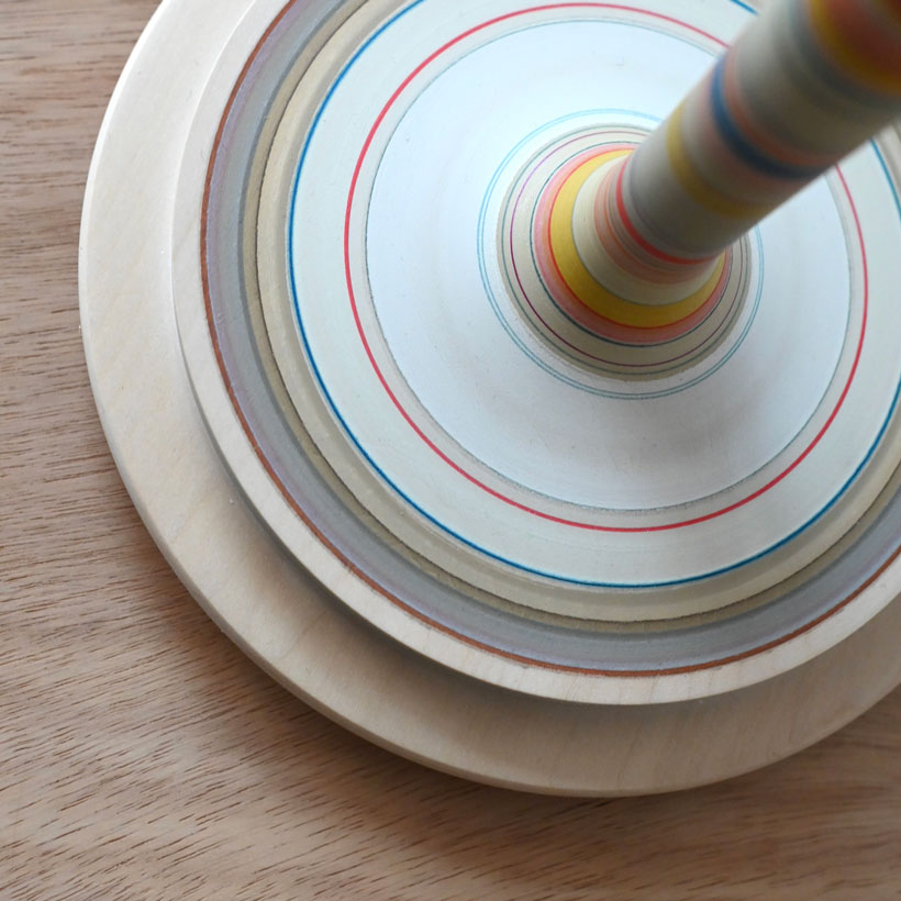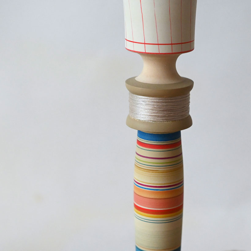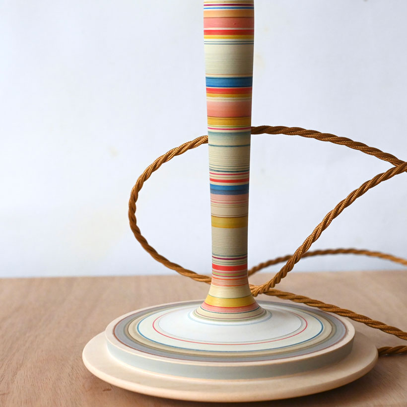 A elegant and  colourful lamp made from lime with a cotton reel motif, the lamp is painted with bright and also fine multi-coloured stripes, with areas of minimal fine lines breaking up other colourful areas, a bit like a repeat pattern.  There is a large cream reel wound with beige thread. The base has broader and simpler bands of greys with yellow and green accents.   There is a section of natural wood above the reel and then a section at the very top painted in a warm cream with fine red lines, really lovely. This lamp will always hold interest as there are so many interesting juxtapositions of colours within it, great on a bedside table! This lamp is photographed with a 20cm plain linen shade, it would be worth considering one of my unique silk screen printed shades as well. A 23cm or 25cm shade would also be appropriate.